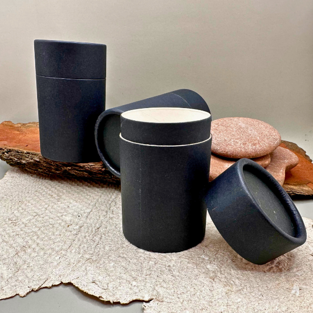 Limited stock available. These Black Kraft  paper cylinders can be used to hold 150ml of bath salts or 60 capsules. The  pots are lined with a leak proof wax layer, the same lining as the push up tubes.